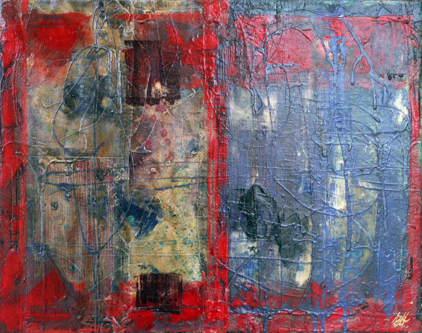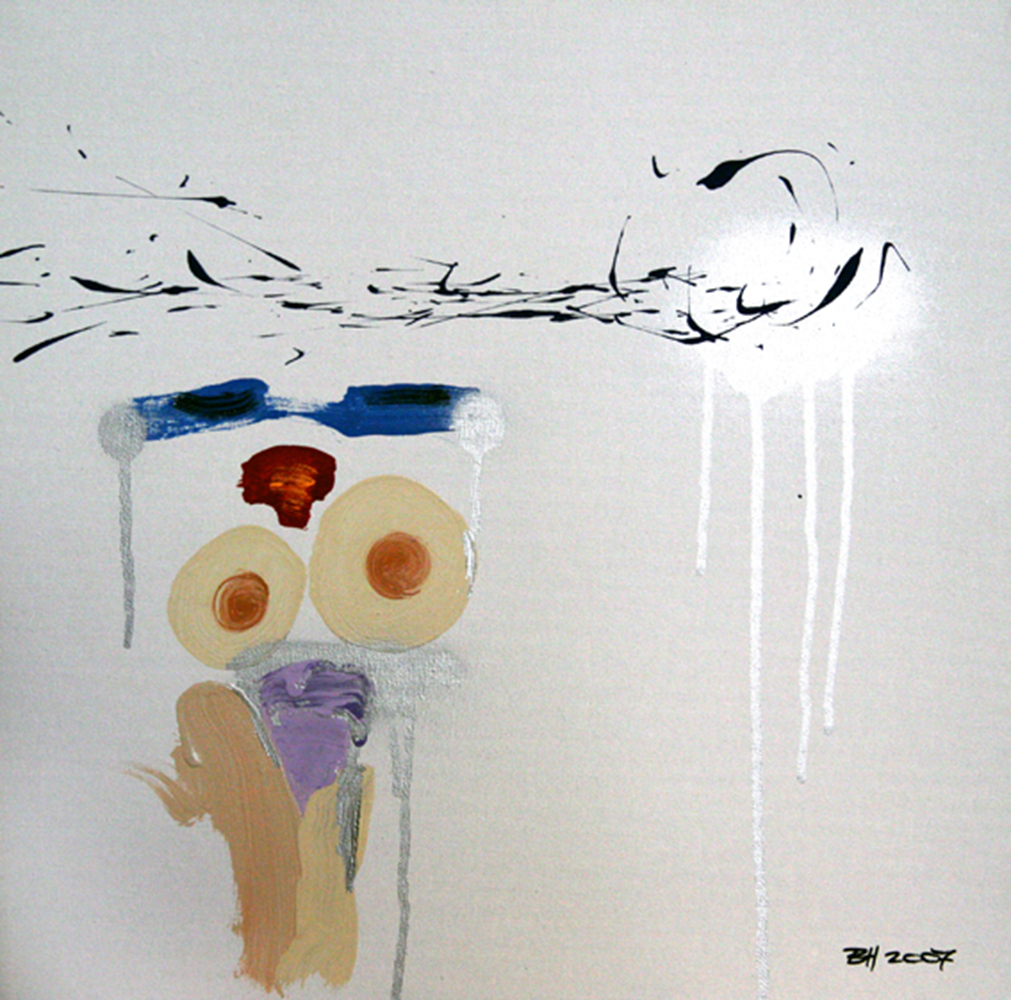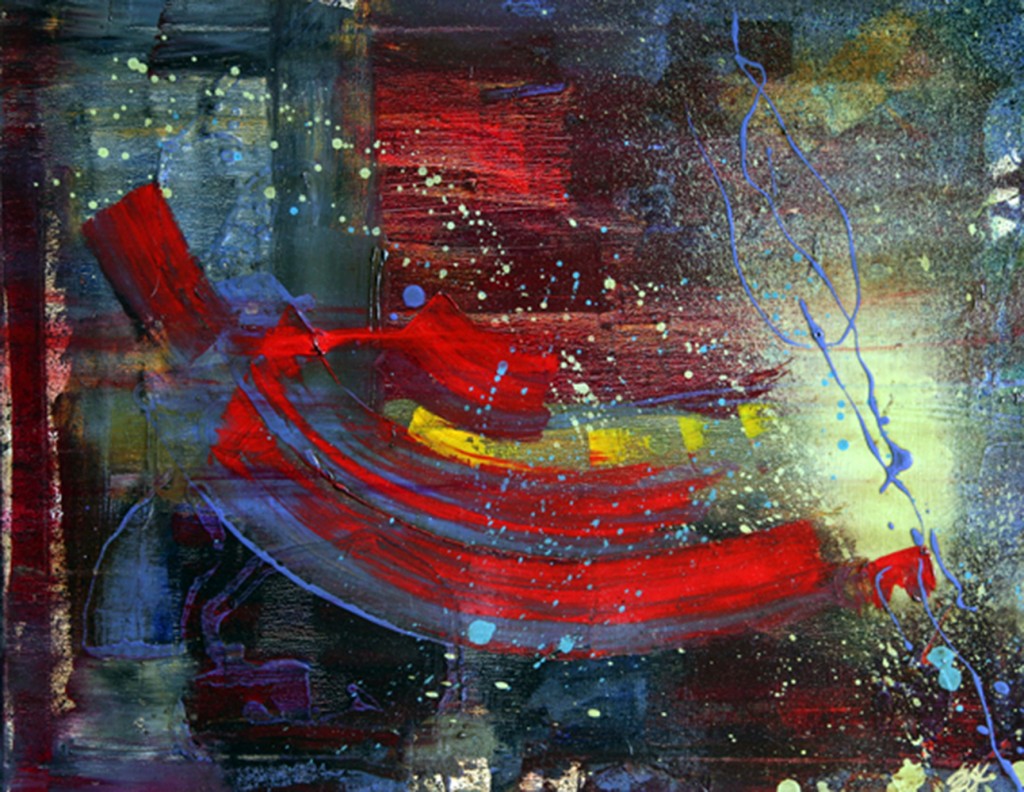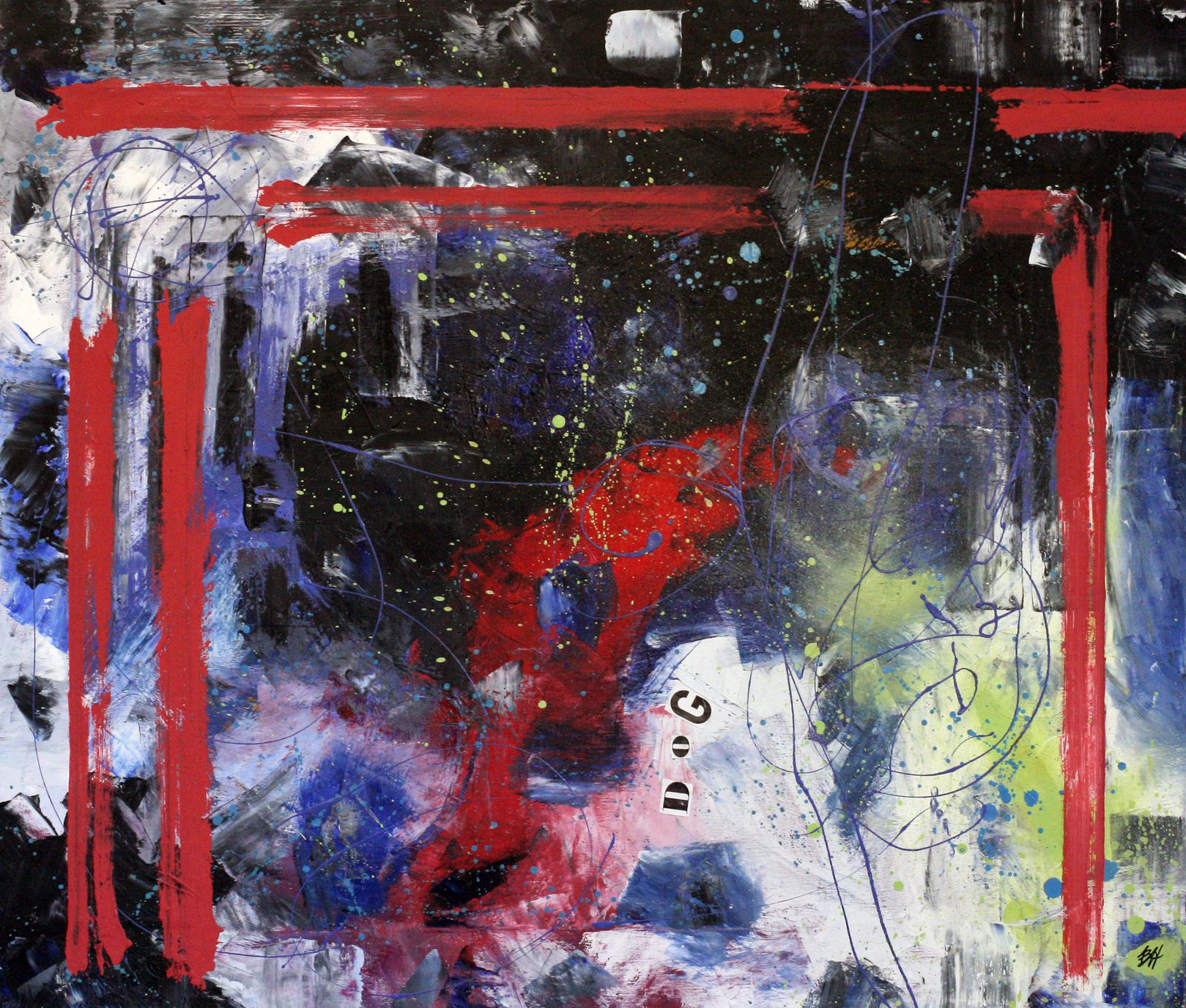 “I was born in 1970 and am largely a self-taught artist, I use my artwork as a means of staying well. The painting is about coping with the highs and lows of schizophrenia and drinking on the streets stuck in a rut. Maybe it was artist’s block and submitting to illness. I have used the dog to represent the lows and euphoric smiling devil as the highs in an abstract form in oils and spray paint, my main two chosen media that I work in. The red lines around the edge symbolise the prison of the mind and a route to self destruction with a black background as an expression of the dark side.”