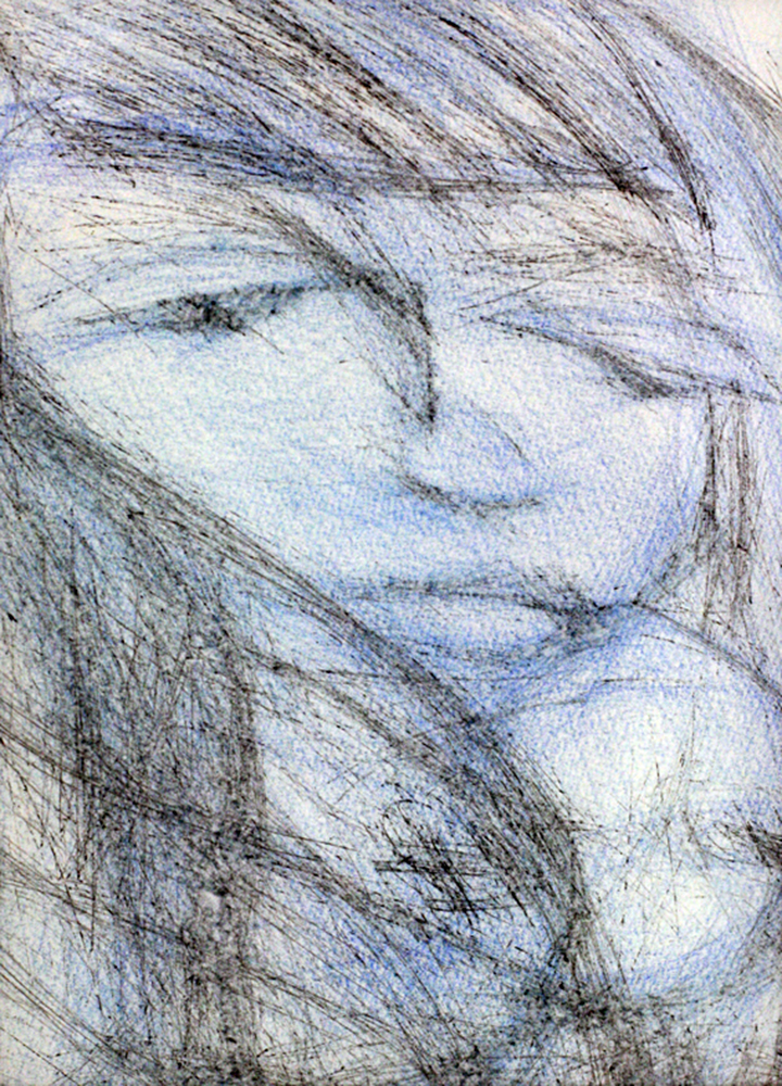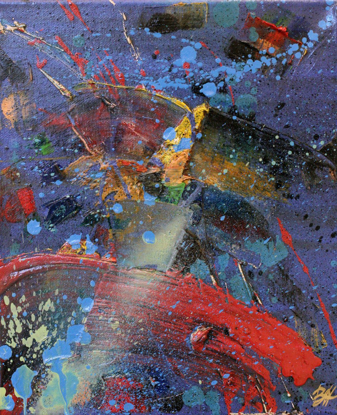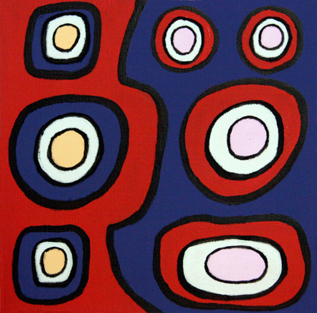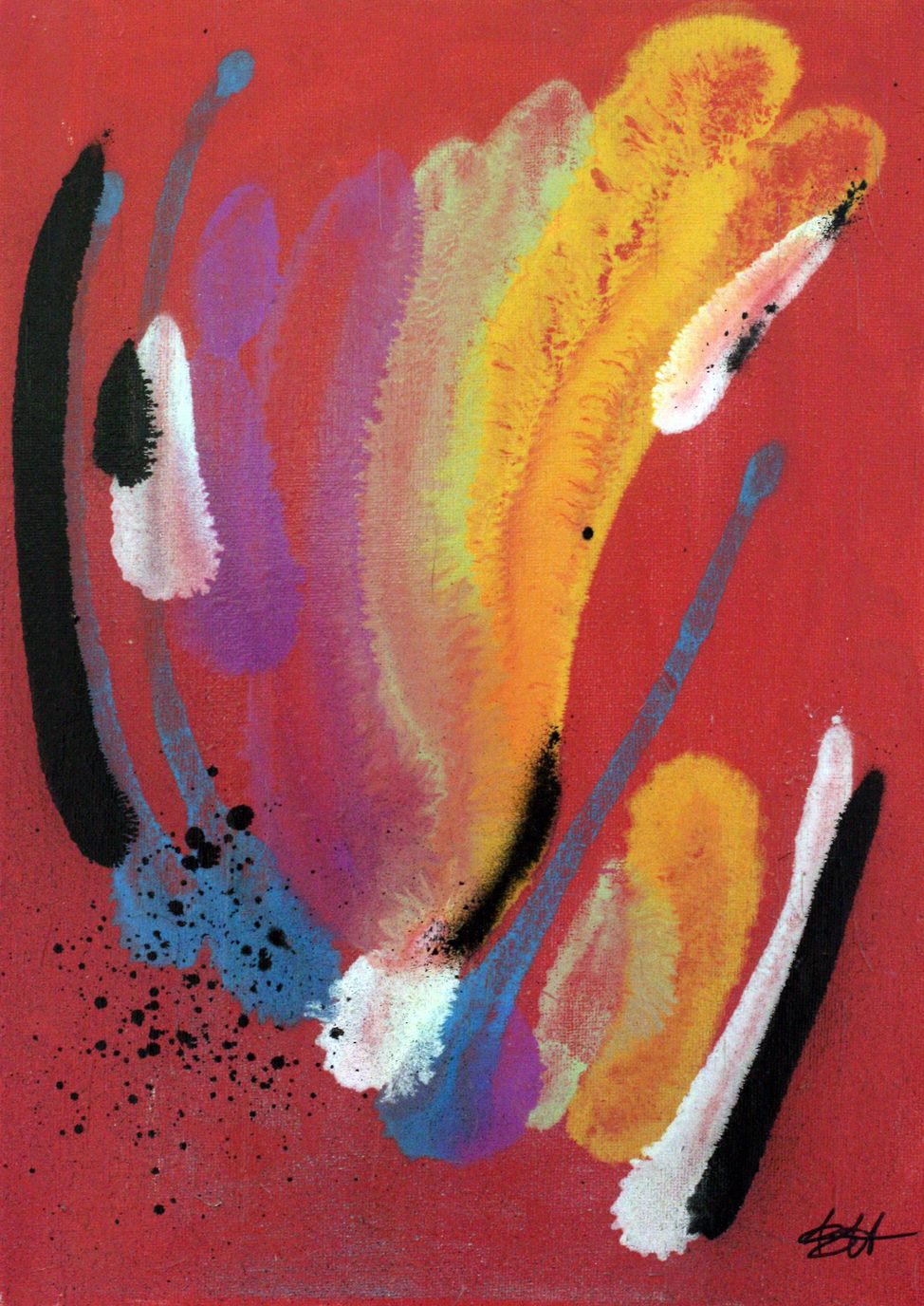 “I was born in 1970 and am largely a self-taught artist, I use my artwork as a means of staying well. The painting is about coping with the highs and lows of schizophrenia and drinking on the streets stuck in a rut. Maybe it was artist’s block and submitting to illness. I have used the dog to represent the lows and euphoric smiling devil as the highs in an abstract form in oils and spray paint, my main two chosen media that I work in. The red lines around the edge symbolise the prison of the mind and a route to self destruction with a black background as an expression of the dark side.”