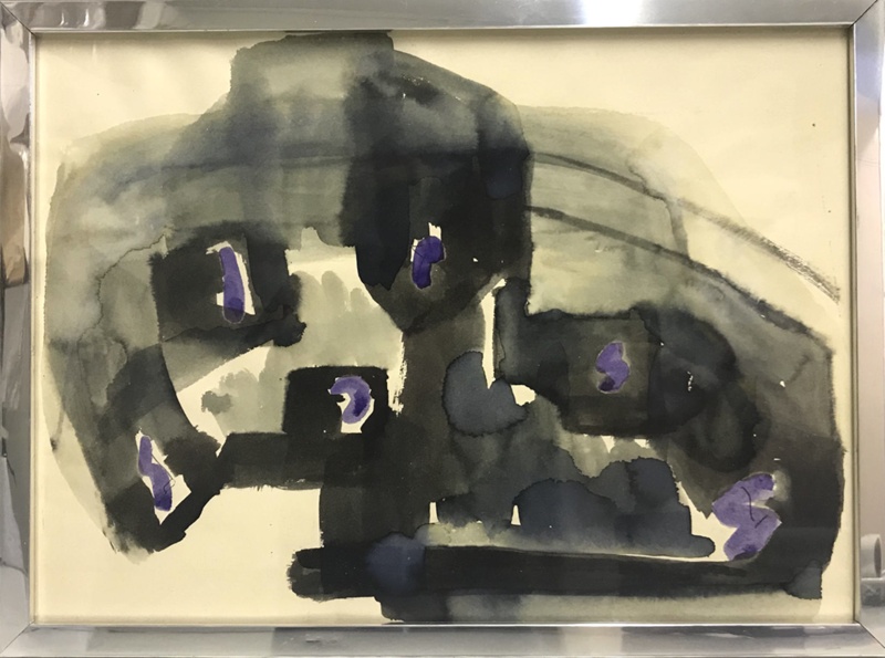 About this objectColoured inks on paper, black and blue patches ink with smaller blue dabs.