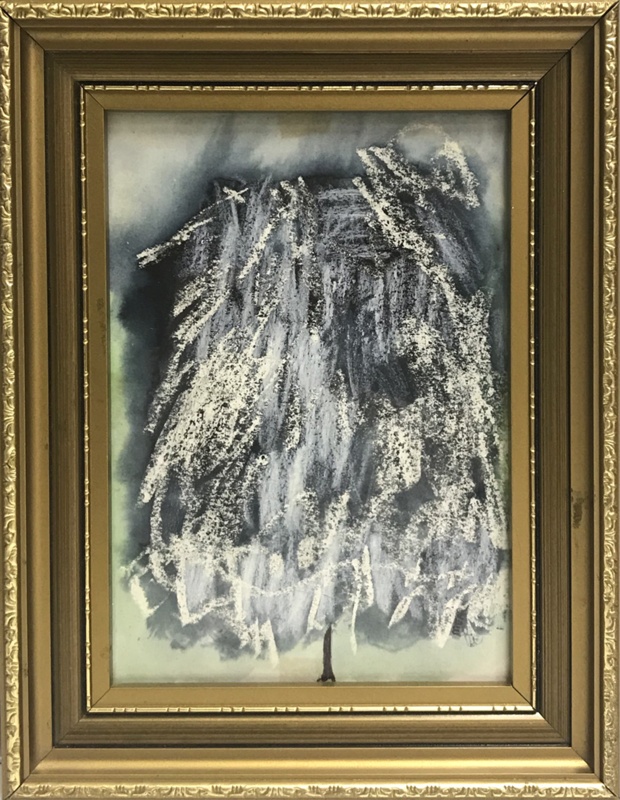 About this objectPastel and ink on paper, loose and busy white pastel marks, small brown ink mark at bottom suggests tree trunk.