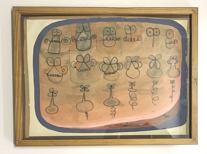 About this objectGouache painting, series of 18 unique hand drawn symbols/characters drawn in black line, over a pink orange shape, bordered with grey blue. Dated 1967 and signed ‘Mear’.