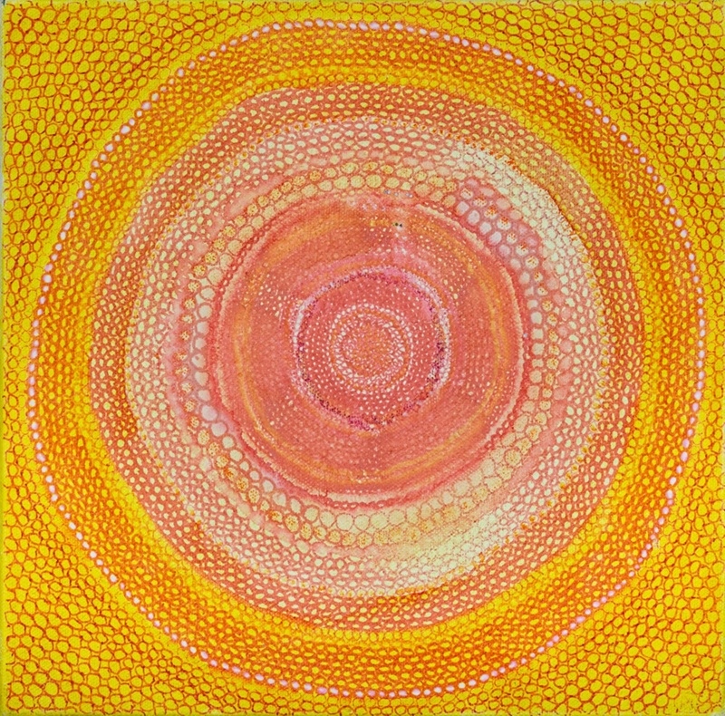 About this objectWater based colours painted onto canvas, small orange, yellow and red circles arranged into a bigger circular form.