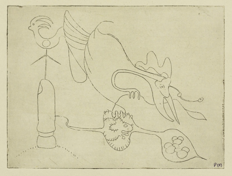 About this objectA fine black print depicting various shapes and a bird-like figure.