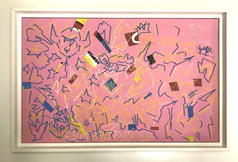 About this objectPink board on which yellow and blue geometric lines and shapes are drawn in paint pen.