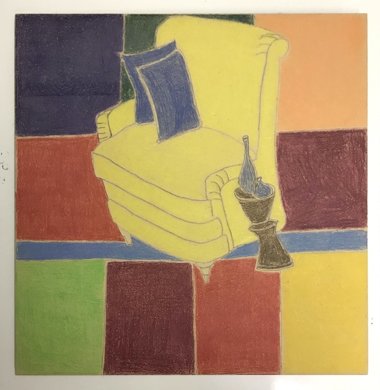 About this objectYellow chair with blue cushions against multicoloured checkerboard background.