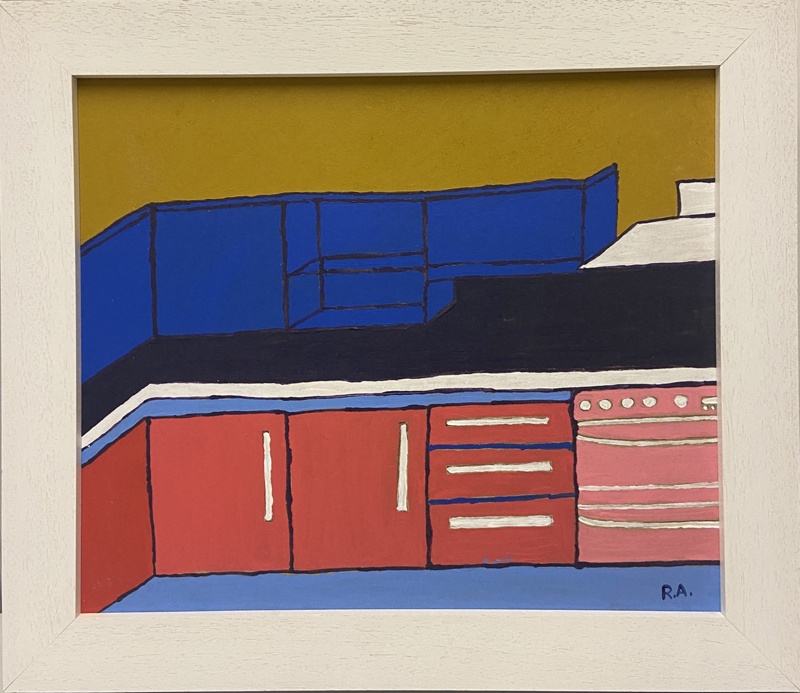 About this objectKitchen scene formed of block colours. Red cupboards, pink oven to right. Black work surface, yellow wall at top. Light blue floor.