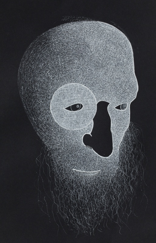 About this objectWhite ink on black paper depicting a white face with a long beard, a circle over one eye, and a black nose.