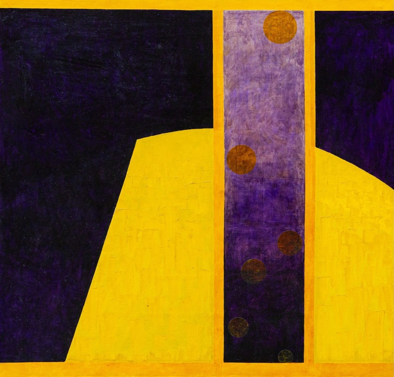 About this objectOil on Canvas. On a bold yellow background there are two large deep purple shapes. These are intersected by a large vertical rectangle that has been painted with a purple fade and yellow circles. Paint application of the yellow shapes is thick. Glossy finish.