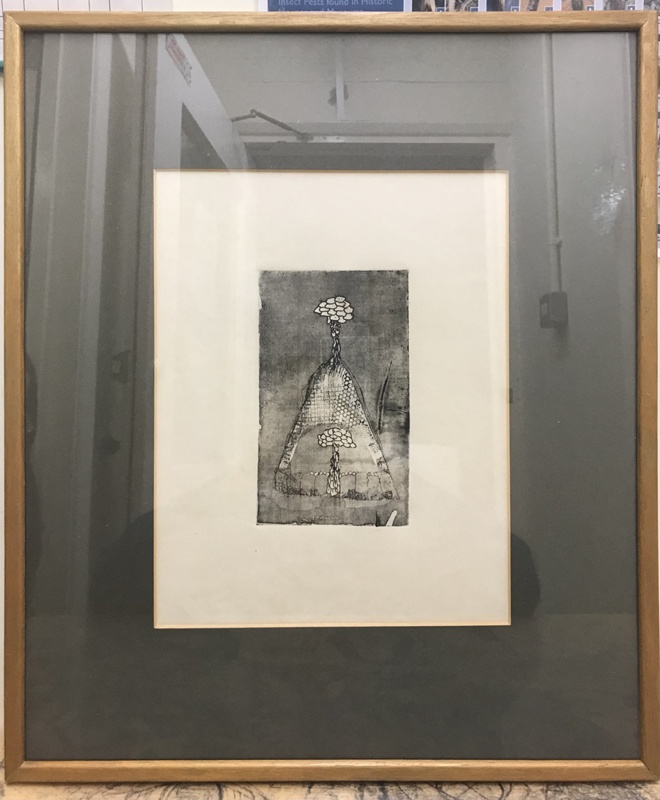 About this objectEtching on paper. Image of two trees, one within the base of the other tree, drawn with a fine line and surrounded by a grey background. Small patches of texture created by the printing process.