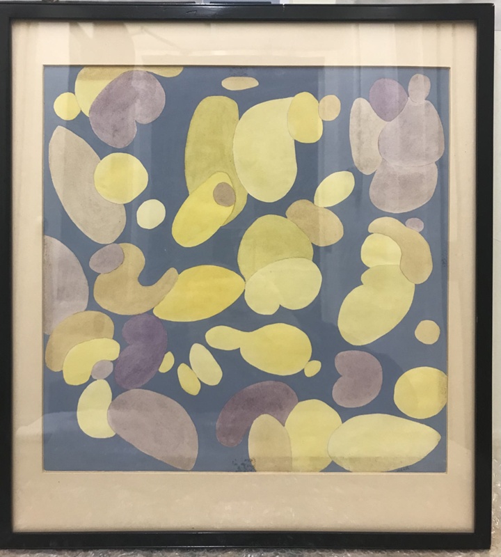 About this objectGouache and watercolour on paper. Yellow and purple organic bubble-like forms nested into each other and spread over the composition, against a pale opaque blue background. Signature in bottom right hand corner. Information on label on reverse says ‘Imaginative abstract from the Natural History Museum’.
