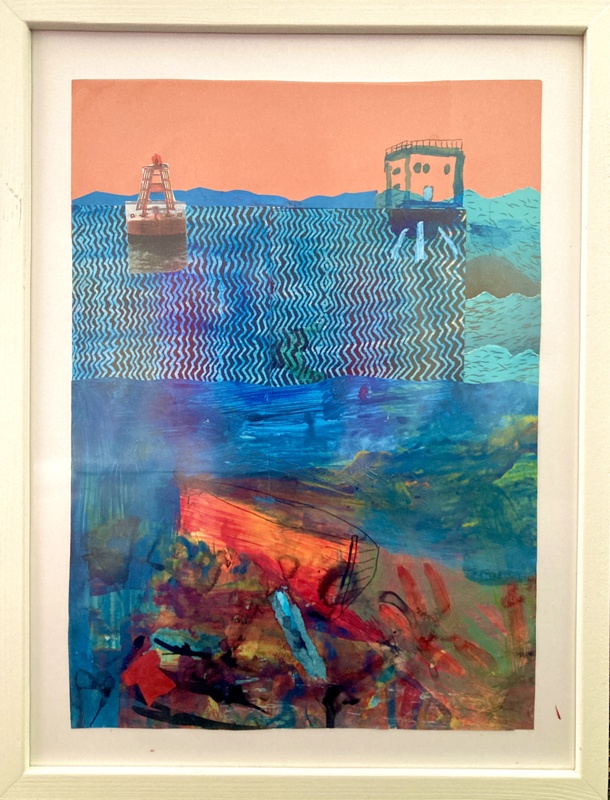 About this objectMixed media image of a blue body of water against an orange sky and rocks in the foreground. The outline of a boat against the rocks.