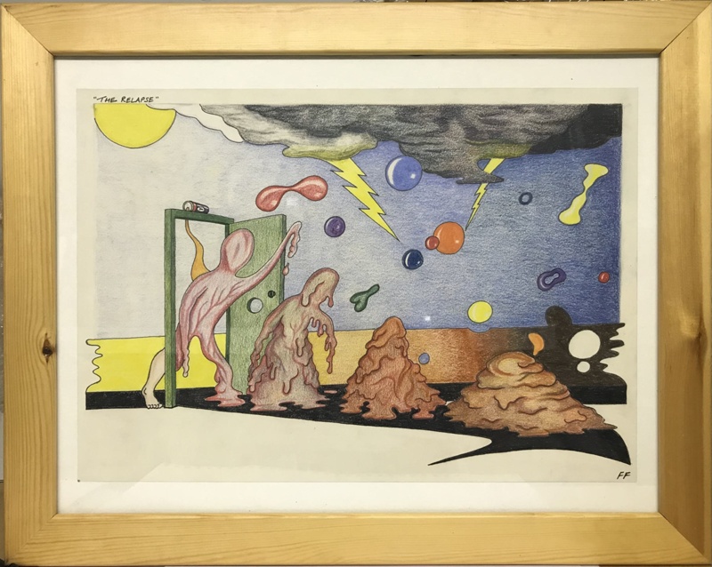 About this objectPencil and pen drawing. Four figures coming through a green door to an abstract landscape with grey clouds with lightning bolts.